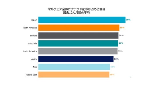 - 日本はマルウェアの配布にクラウドアプリケーションが悪用される割合において、他の地域と比べて高い(日本59%、他の地域53%)。