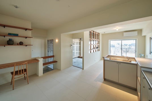 仕切り壁の間柱と横胴縁を生かし、視線の抜けを創出。棚としても再利用。