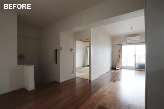 舞台となったのは、築57年のマンション。2LDKのメゾネット住戸で、各部位は比較的新しく機能面としては継続使用が可能な状態でありながらも、断片的なリフォームにより意匠の統一性を欠いていました。現場の職人のアイデアやスキル、コンセプトへの共感を軸に、既存内装建材、設備を撤去せずに活用する手法を見出しながら、全体を再構築。解体による廃棄物や下地の再制作費用を軽減すると同時に、スケルトンを前提としない新たなリノベーション手法を見出しました。
