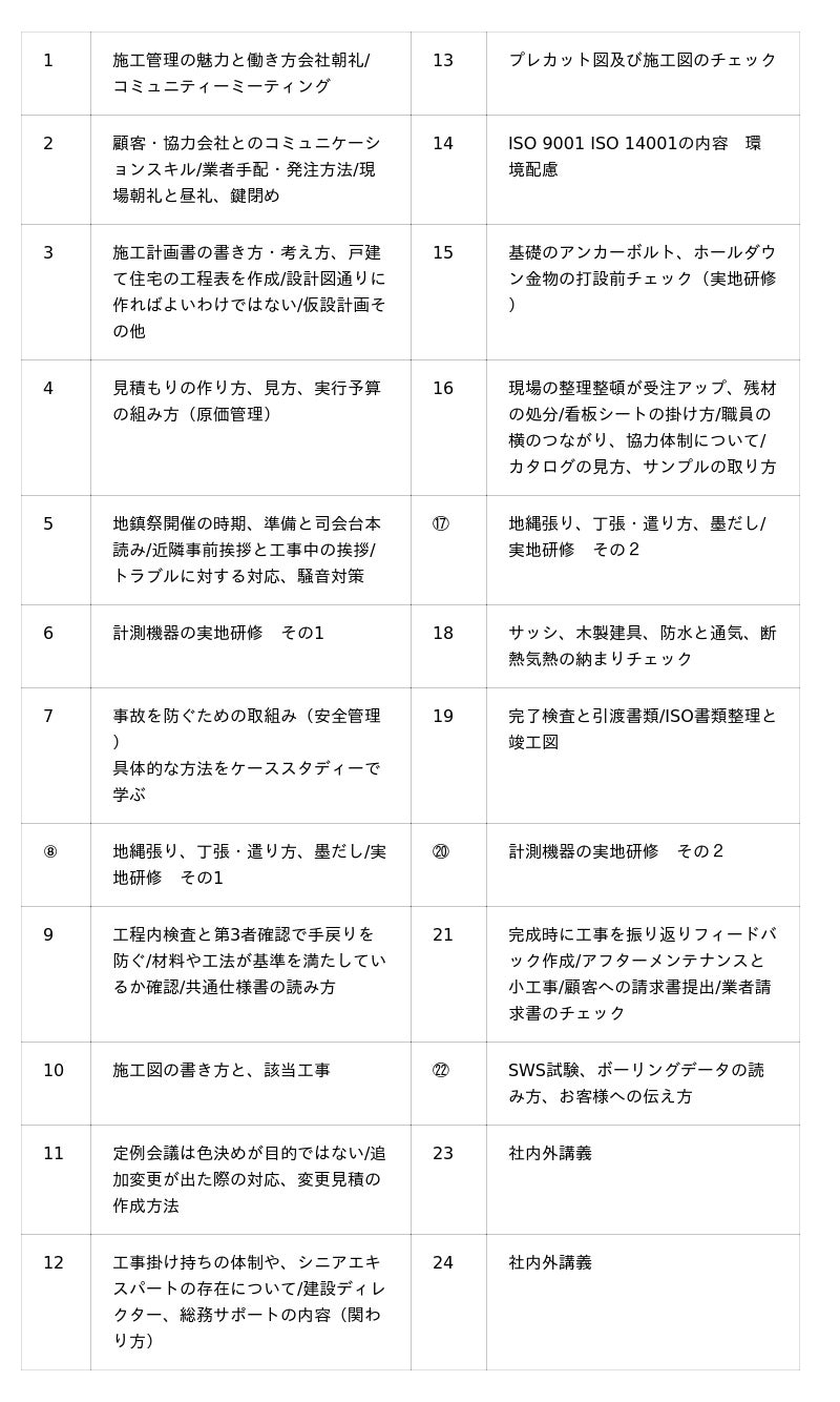 1年目は、現場で必要な基礎を体系的に学び、2年目は、更地から完成するまでの流れを理解し、木造住宅の責任者としての不安を軽減する内容としました。