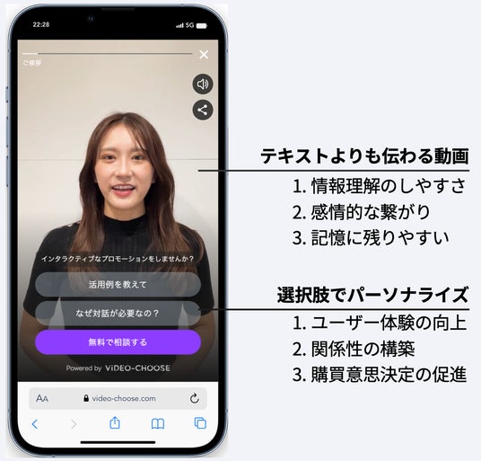AIと動画の活用で、新たな顧客体験を提供するNewSpot株式会社(本社:東京都新宿区、代表取締役:大貫 修平、以下 当社)は、顧客体験の向上と受注数やリード獲得数の増加に貢献する国内初※1の動画版チャットボットツール「VideoChoose(ビデオチューズ)」をリリースしました。信頼性や安心感、効率的なメッセージ伝達により、エンゲージメントの向上に貢献します。
