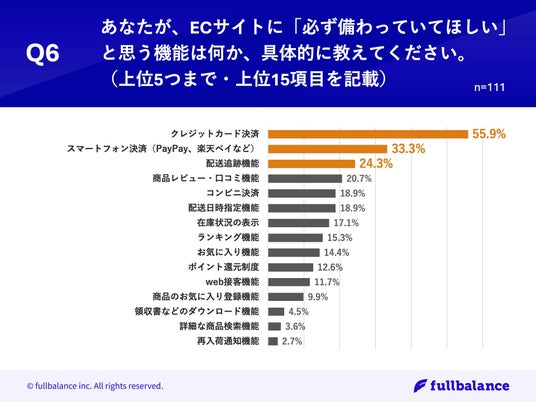 「Q6.あなたが、ECサイトに「必ず備わっていてほしい」と思う機能は何か、具体的に教えてください。(上位5つまで)」(n=111)と質問したところ、「クレジットカード決済」が55.9%、「スマートフォン決済(PayPay、楽天ペイなど)」が33.3%、「配送追跡機能」が24.3%という回答となりました。