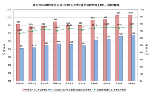 ここ10年、火災の発生数はほぼ横ばい、死亡者数は高齢者を中心に微増
