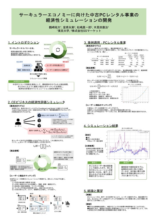 株式会社SSマーケット(本社:東京都八王子市、代表取締役:星山 常進)は、東京大学大学院工学系研究科技術経営戦略学専攻 鶴崎祐大氏、木見田康治特任准教授との共同研究成果が、2024年11月30日に開催された「エコデザイン・プロダクツ&サービスシンポジウム2024」において発表され、ベストポスター賞を受賞したことをお知らせいたします。 本研究のテーマ「サーキュラーエコノミーに向けた中古PCレンタル事業の経済性シミュレ ーションの開発」は、持続可能なビジネスモデルを追求する重要な取り組みとして、多くの注目を集めました。
