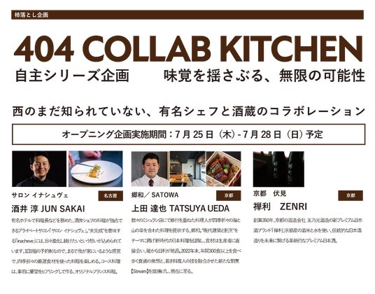 オープニングに合わせて開催される企画第一弾は「404 COLLAB KITCHEN」企画。1日1組の完全予約制レストラン「サロンイナシュべ」を主催する名古屋の酒井淳シェフと、現代建築と割烹をテーマにした日本料理を展開する郷和の上田達也シェフが、京都の有名酒蔵・玉乃光酒造のプレミアムな日本酒とコラボレーションします。「料理」の枠を超えたクリエイティビティと情熱が集結し、あらゆる食の魅力を引き出すこの場所で、無限の可能性に満ちた食の旅をお楽しみください!