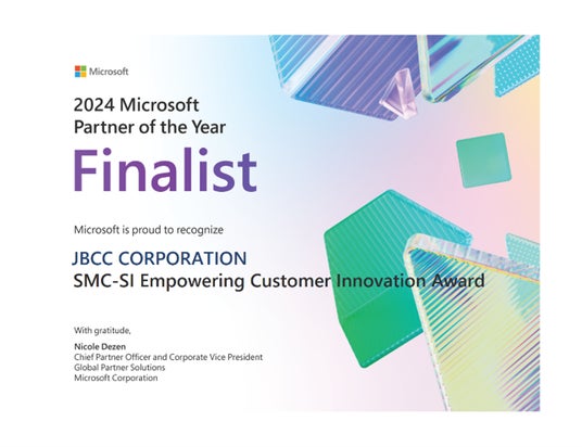 ITサービス業のJBCC株式会社(本社:東京都中央区、社長:東上 征司、以下JBCC)は日本時間の6月27日、米国 Microsoft Corporation(以下マイクロソフト)が世界中の30万社を超えるパートナー企業を対象としたアワード「Microsoft Partner of the Year Awards」において、SMC-SI Empowering Customer Innovation部門でファイナリスト3社に選出されました。