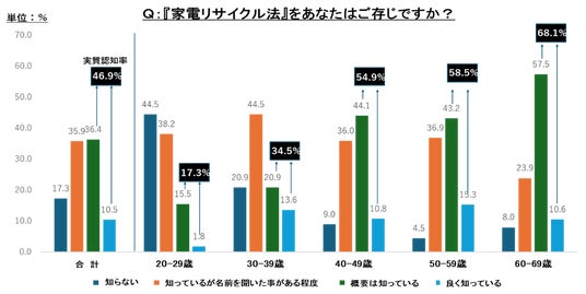 2001年4月に家電リサイクル法(特定家庭用機器再商品化法)が施行され、家電4品目(テレビ・エアコン・冷蔵庫・洗濯機)のリサイクルが義務化されてから24年が経過致しましたが、家電製品協会が行った認知度調査では若い年齢層ほど家電リサイクル法の存在や正しい廃家電の処分方法を知らない実態が浮き彫りになって参りました。