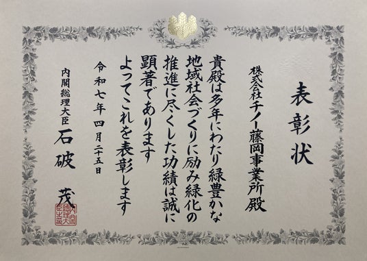 株式会社チノー(東京都板橋区、代表取締役社長:豊田三喜男、東証プライム:6850)藤岡事業所は、2025年4月、令和7年緑化推進運動功労者内閣総理大臣表彰を受賞しました。