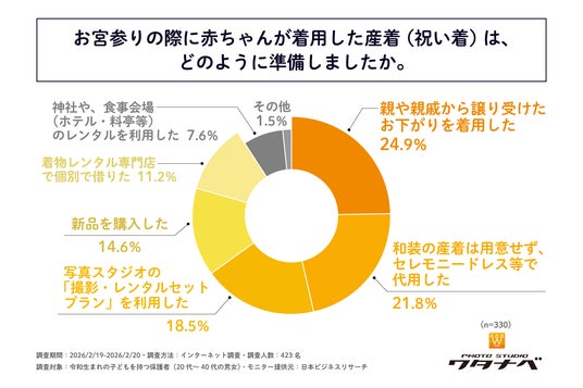 続いて、令和生まれの子どもを持ち、お宮参り経験のある保護者を対象に「お宮参りの際に赤ちゃんが着用した産着(祝い着)は、どのように準備したか」を尋ねる設問への回答では、1位が「親や親戚から譲り受けたお下がりを着用した」で24.9%、2位が「和装の産着は用意せず、セレモニードレス等で代用した」で21.8%、3位が「写真スタジオの『撮影・レンタルセットプラン』を利用した」で18.5%という結果になりました。この結果から、お宮参りの際に赤ちゃんが着用した産着の主な準備方法は、「親や親戚から譲り受けたお下がりの着用」や「和装の産着は用意せず、セレモニードレス等で代用」であることがわかりました。