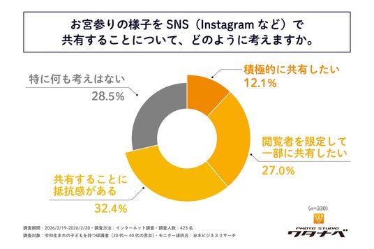 調査の最後、令和生まれの子どもを持ち、お宮参り経験のある保護者を対象に「お宮参りの様子をSNS(Instagramなど)で共有することについて、どのように考えるか」を尋ねる設問への回答では、1位が「共有することに抵抗感がある」で32.4%、2位が「特に何も考えはない」で28.5%、3位が「閲覧者を限定して一部に共有したい」で27.0%、4位が「積極的に共有したい」で12.1%という結果になりました。「共有することに抵抗感がある」という回答が最も多いものの、3位と4位の各回答の比率を合計すると39.1%となり、この結果から、令和生まれの子どもを持ち、お宮参り経験のある保護者の約4割が、お宮参りの様子をSNSで何らかの形で共有したいと考えていることが判明しました。