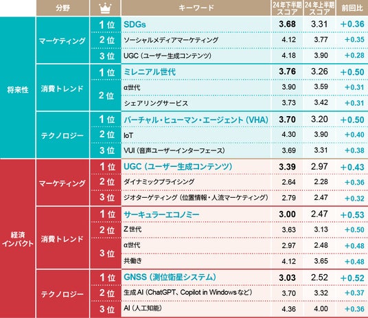 24年4月に実施した前回調査との比較で、分野別で将来性スコアが伸びたトップ3は、マーケティング分野では1位「SDGs」(持続可能な開発目標)、2位「ソーシャルメディアマーケティング」、3位「UGC(ユーザー生成コンテンツ)」となりました。また、消費トレンド分野では1位「ミレニアル世代」、2位「α世代」「シェアリングサービス」、テクノロジー分野では1位「バーチャル・ヒューマン・エージェント(VHA)」、2位「IoT」、3位「VUI(音声ユーザーインターフェース)」でした。