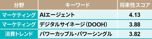 時流を踏まえて今回の調査から新たに追加したキーワードは、マーケティング分野の「AIエージェント」「デジタルサイネージ(DOOH)」、消費トレンド分野の「パワーカップル・パワーシングル」です。分野別スコアランキングは、マーケティング分野のAIエージェントが32キーワード中8位、デジタルサイネージが17位でした。消費トレンド分野のパワーカップル・パワーシングルは、33キーワード中10位でした。