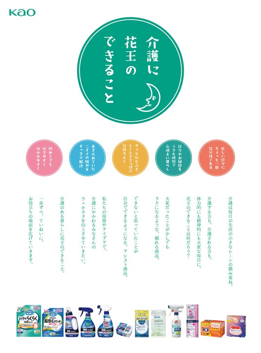 このような社会背景を受け、花王は暮らしにお役立ちする様々な製品を通じて、介護生活を快適にすることを目指し、カテゴリー横断型の新提案「介護のある暮らしに花王のできること」を推進してまいります。
