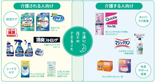 花王株式会社は介護世帯の増加を受け、「リリーフ」や「消臭ストロング」などの介護用品や家事負担軽減商品を通じ、介護する人・される人を支える「介護のある暮らしに花王のできること」包括提案を開始します。