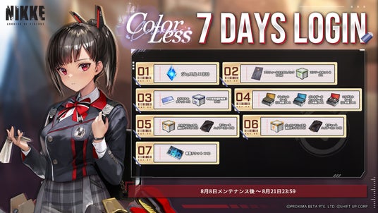 また、SSRニケ「マルチャーナ」の学生制服姿限定コスチュームも新に登場します。さらに、「COLORLESS」の実装を記念して、毎日ログインするだけで募集チケットや育成素材が獲得できる「7 Days Loginイベント-JUST ANOTHER DAY」が開催されますので、ぜひ奮ってご参加ください。