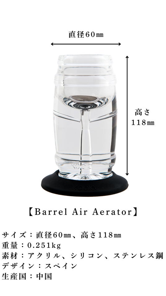 Barrel Airは、ワインの温度を変えずに風味を引き出し、ワインを美味しくする樽型デザインのエアレーターです。簡単に使用ができ、Barrel Airを持って注ぐだけで渋みや酸味の強いワインをまろやかにして飲みやすくします。
