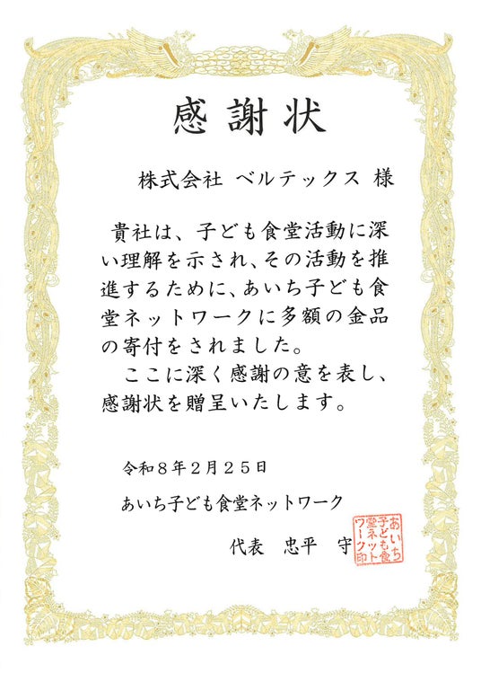 株式会社ベルテックス(所在地:東京都新宿区、代表取締役:梶尾 祐司)は、あいち銀行が提供する「コンサルプラス・地域貢献(寄付・寄贈)コース」を活用し、愛知県内328か所(2025年10月末現在)の子ども食堂が参加する「あいち子ども食堂ネットワーク」へ寄付を行い、2026年2月25日に寄贈式を実施いたしました。