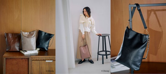 トートバッグは大ぶりなミッキーマウスのシルエットをエンボス加工で取り入れた大人っぽいデザインに。A4サイズが入る大容量のサイジングも魅力です。取り外し可能なチェーンとベルトの2種類の持ち手をつけることで、シーンやコーディネートによって付け替えてスタイリングを楽しむことができます。柔らかく、程よいツヤのある合成皮革を使用。柔らかい印象のグレージュ、おしゃれ見えを叶えるブラウン、定番のブラックのベーシックカラー3色での展開で、お仕事シーンにもお使いいただけるバッグです。