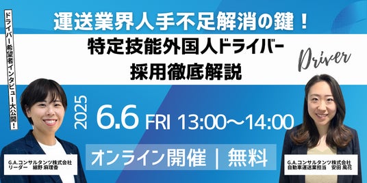 『運送業界人手不足解消の鍵!特定技能外国人ドライバー採用徹底解説』オンラインセミナー- G.A.コンサルタンツ主催、6/10(火)に開催