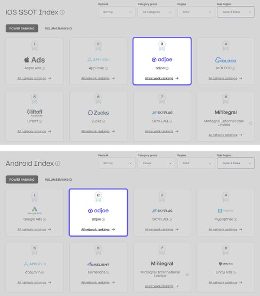 今年のインデックスでは、adjoeはグローバルiOSゲームパワーランキングにおいてトップ6メディアソースにランクインし、41のリストにおける総合スコアにより、iOSとAndroidの両プラットフォームを合わせたボリュームベースでNo.1のリワード広告ネットワークとなりました。