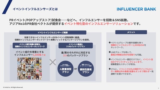 株式会社ベクトル(本社:東京都港区、代表取締役会長兼社長CEO:西江肇司、東証プライム:6058、以下ベクトル)の子会社である株式会社イニシャル(代表取締役:藤原 由惟 、以下イニシャル)内インフルエンサー特化ユニット”INFLUENCER BANK”は、SNS時代におけるイベントの集客・拡散課題を解決するため、イベントへのインフルエンサー招致に特化した『イベントインフルエンサーズ』の提供を開始いたします。