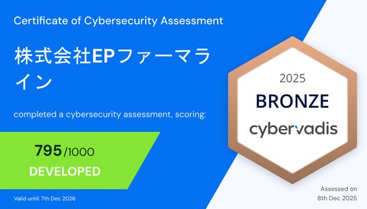 医薬・医療業界に特化した総合BPO企業である株式会社EPファーマライン(所在地:東京都豊島区、代表取締役社長 伊勢 由多可 以下「当社」)は、第三者評価機関CyberVadisによるサイバーセキュリティ評価において「ブロンズ」認定を取得しました。