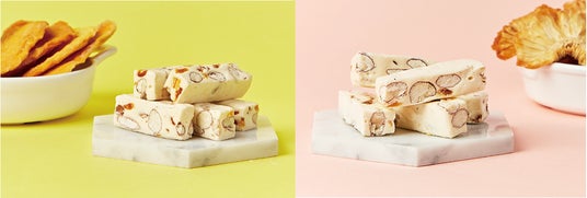 Sunnygogo がこだわりを持って作ったドライフルーツを使ったヌガー商品がパイナップルヌガーとマンゴーヌガーです。ドライパイナップルとドライマンゴーをそれぞれアーモンドと一緒にミルク味のヌガーに練り込み、柔らかく味わい深いヌガー商品に仕上げています。凝固剤や香料が入っていないため、歯につきにくく食べやすくなっています。