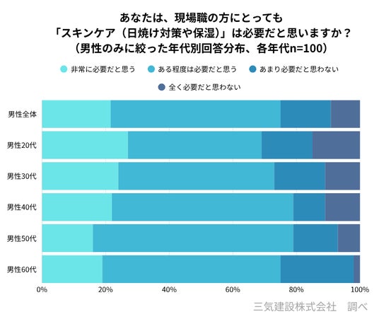 若年層は身だしなみとしての「意識の高さ」が先行している一方、ベテラン層は長年の屋外作業による負担が蓄積し、「深刻な肌ダメージ」という実害に直面していることが、必要性の高い実感に繋がっていると推察されます。