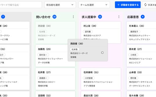 ボード上では、各求職者の情報がステータスごとの列に分類され、カード形式で表示されます。各カードはドラッグ&ドロップでステータスの移動ができ、進捗更新の操作も直感的に可能。さらに、担当者別の絞り込み表示にも対応しており、情報の整理に役立ちます。