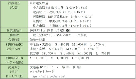 京阪ホールディングス株式会社(社長:石丸 昌宏、以下「京阪ホールディングス」)、京阪電気鉄道株式会社(社長:平川 良浩、以下「京阪電気鉄道」)と株式会社JR東日本スマートロジスティクス(代表取締役:市原 康史、以下「JR東日本スマロジ」)は、予約・キャッシュレス・多言語対応可能な多機能ロッカー『マルチエキューブ』を関西の駅では初めて、京阪電気鉄道の大阪府内の5駅(中之島、北浜、天満橋、京橋、枚方市)に2025年4月25日(金)より設置いたします。
