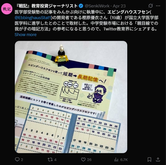 医学部受験塾に関する記事執筆中に、暗記ツール「エビングハウスフセン」開発者の樫原優衣さん(19歳、国立大学医学部医学科進学)に取材。