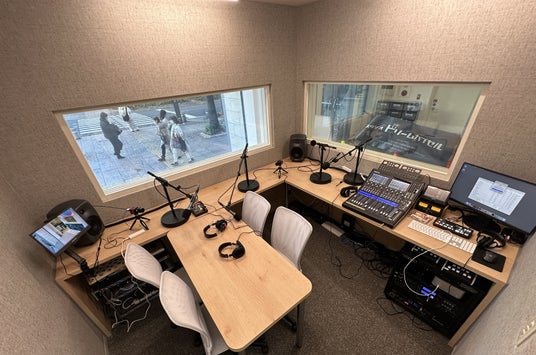 【スタジオ ドリームカプセル 内部】 ラジオ放送局でも使用される最新機材を揃え、You tube等各種SNSでの動画配信も行うことが可能。
