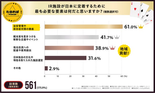また、「IR施設の日本定着での必要な要素」として挙げられたなかでTOP3にランクインしたのは、『地元住民への配慮や雇用創出(38.9%)』と、ここでも地域への貢献を意識した回答でした。