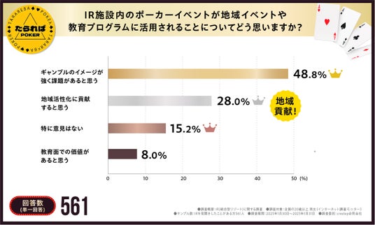 今や頭脳トレーニングや戦略ゲームとしても注目を集めるポーカーですが、IR施設内で行われるイベントが、地域に反映され「教育プログラム」への取組みや、「地域のイベントとして活用されるとしたらどう思うか」というアンケートを実施したところ、『地域活性化に貢献すると思う』が28.0%と約3割は地域に貢献できると感じていました。