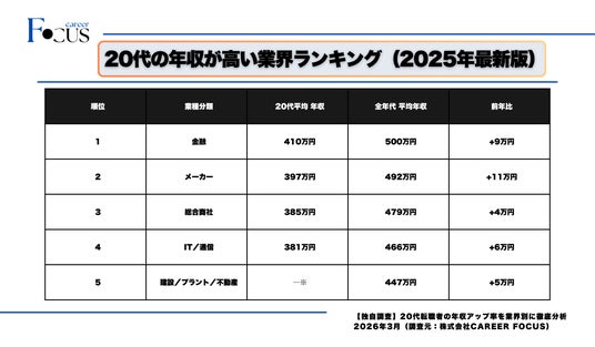 第二新卒・20代のキャリアアップ転職を専門に支援する株式会社CAREER FOCUS(本社:東京都新宿区、代表取締役:東田尚起・丸尾明大)は、厚生労働省「令和6年雇用動向調査」および転職サービスdoda「平均年収ランキング2025」等の公開統計データと自社の転職支援実績を組み合わせ、20代転職者の業界別年収変動実態を分析しました。その結果、20代の転職における年収アップ率は「どの業界に転職するか」によって最大2倍以上の差が生じることが判明。本リリースでは、業界別の年収ランキングに加え、当社エージェント「キャリアフォーカス(旧:攻めキャリ)」利用者の年収アップ事例を実名ベースで公開し、第二新卒・20代が年収を最大化するための転職戦略を提言します。