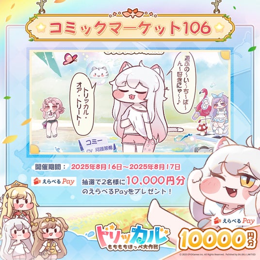 『トリッカル・もちもちほっペ大作戦』が、ついに東京にやってきます! 2025年8月16日(土)~8月17日(日)の開催期間中、C106に超大型広告を展開します! コミー、エルフィン、バターなどの使徒たちが、西1・2ホール内で教主様をお待ちしています! 巨大なフォトスポット用ピラーのほか、無料のうちわも配布予定です。この機会を絶対にお見逃しなく!