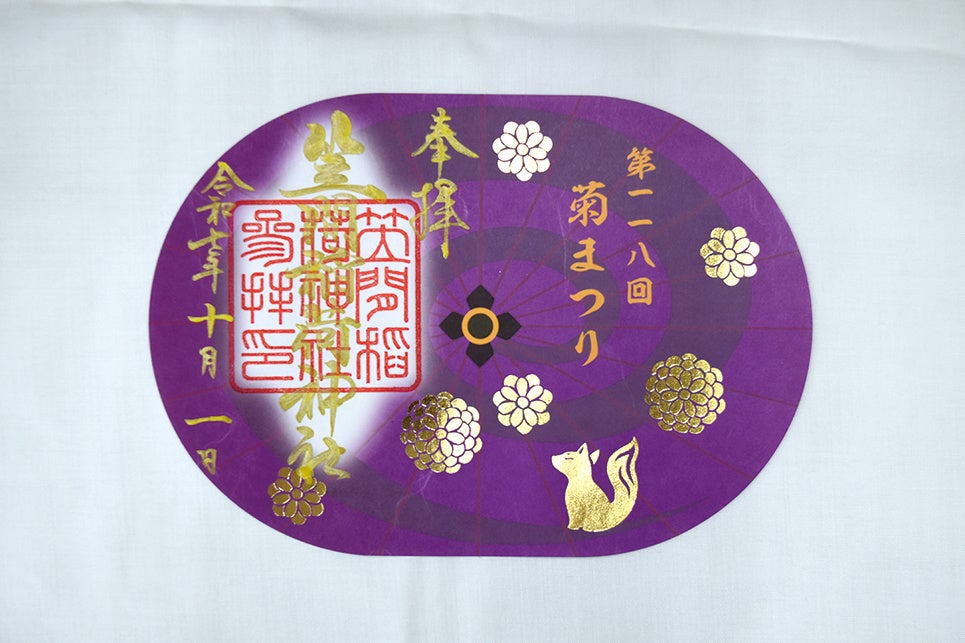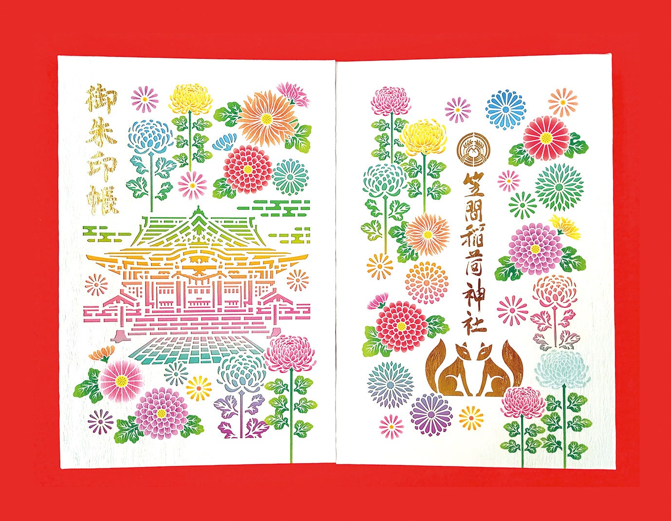 笠間稲荷神社では菊まつり開催に併せて、色鮮やかな菊花と稲荷大神様の神使であるおきつね様を施した切り絵の「御朱印帳」と、和傘をモチーフとした菊まつりの「御朱印」を限定で頒布します菊まつりを訪れた記念にいかがでしょうか。