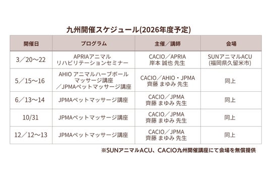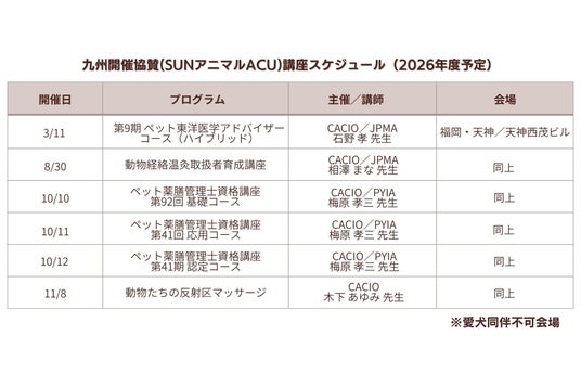 福岡県久留米市に拠点を置く SUNアニマルACU合同会社(CEO & FOUNDER:西原啓史) は、国際動物ケア教育機構 CACIO(Companion Animal Care International Organization/コンパニオンアニマルケア国際機構、代表:宮澤雅之) が主催する2026年度 九州地区教育プログラム において、自社施設を無償で会場提供いたします。