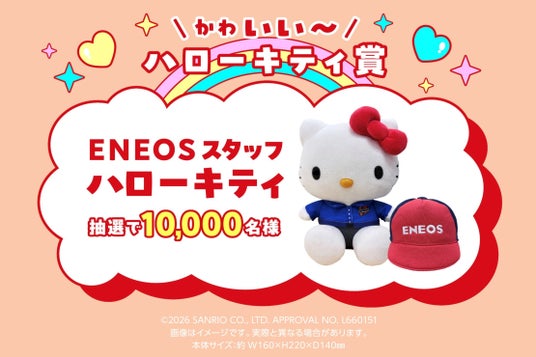 ENEOS株式会社(以下、ENEOS)は、「ENEOS公式アプリ ハローいいこと プレゼントキャンペーン」を、2026年2月1日(日)~2026年3月31日(火)の期間で実施いたします。期間中、ENEOS公式アプリでマイカー登録を行い、1回20L以上の給油をすると、抽選で「ENEOSスタッフハローキティ」のぬいぐるみやご当地グルメカタログなどが当たります。