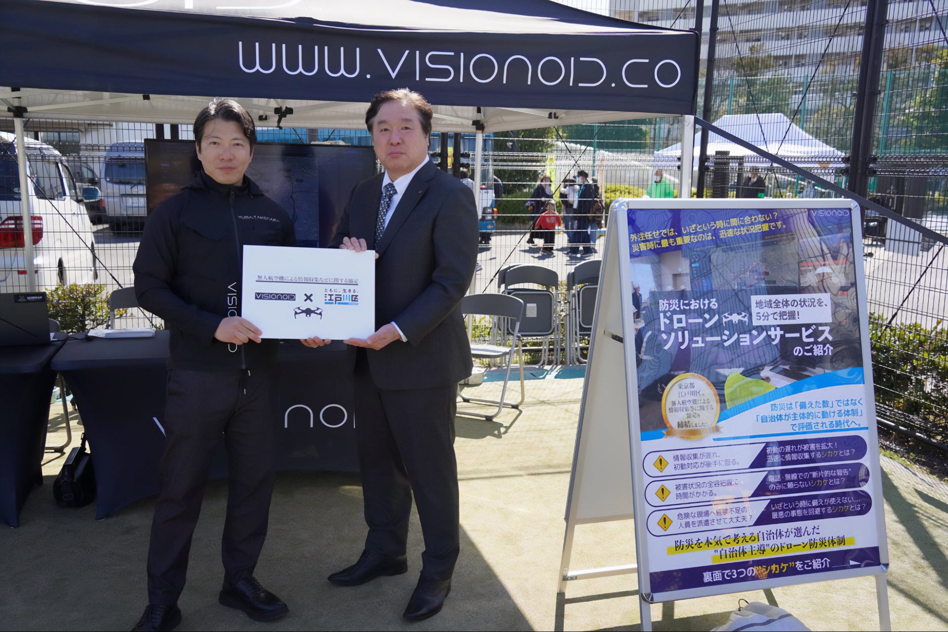 右:江戸川区長 斉藤猛 / 左:VISIONOID株式会社 代表取締役 竹中悠満(2026年3月8日(日)開催の江戸川防災フェア2026にて撮影)
