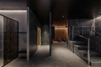 上質かつ非日常の空間に仕上げています。サウナはパブリック用とプライベート用の2種類それぞれ異なる特徴的なデザインとしました。整いスペースの間接照明は緩やかに明滅するゆらぐ演出を採用し、照明・動線・仕上げを総合的に設計し、没入感と回復感を両立しました。
