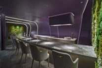 10席のみの、テーマ「異次元」を掲げるフレンチレストラン。天井と壁を7枚の大きなパープルの“スキン”でシームレスに連続させ、照明は必要最小限に抑えることで、深い陰影と没入感を演出しました。弓形の象徴的な天然大理石カウンター越しに料理の所作を間近で望める構成とし、料理体験を引き立てる非日常性をデザインしています。