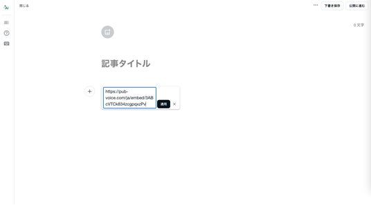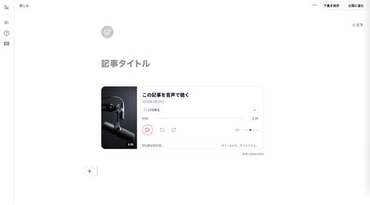 noteのエディタ(記事編集画面)にPUBVOICEのプレイヤーURLをペーストするだけで、再生プレイヤーが洗練されたリッチカード形式で自動展開されます。noteのクリーンな世界観を損なうことなく自然に馴染み、読者は記事を開いたままワンタップでスムーズに音声を楽しむことができます。