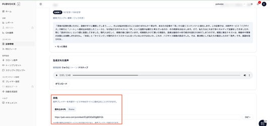 URLの取得:PUBVOICEの管理画面で、音声化したい記事のプレイヤー共有URLをコピーします。