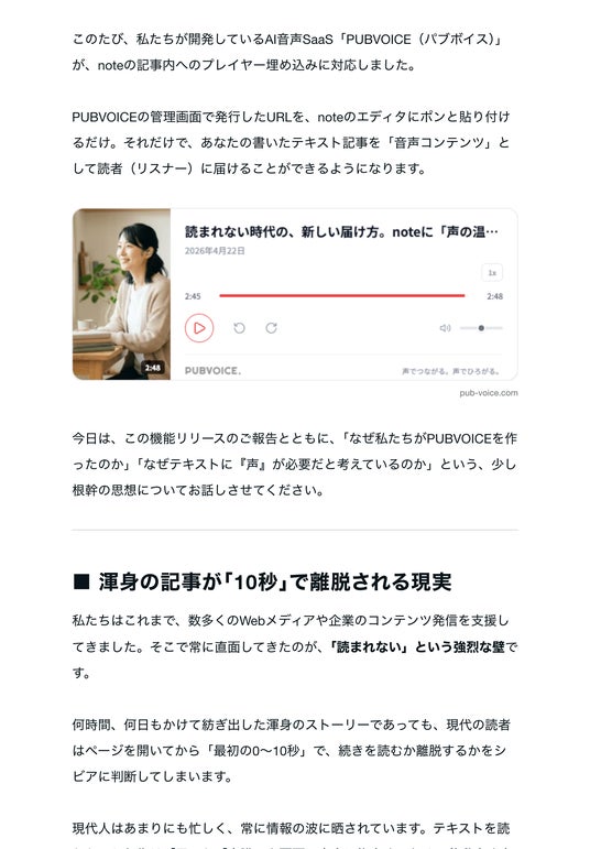 今回のnote連携は、この「離脱の壁」と「接点の壁」を打ち破るためのアップデートです。記事の冒頭にPUBVOICEの音声プレイヤーを配置することで、読者に「ながら聴き」というストレスのない選択肢を提示。テキストを読む余裕がない読者も音声で引き留め、ブランドのストーリーや書き手の熱量を、温度感のある「声」に乗せて深く届けることができます。