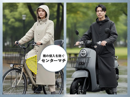 ■センターマチ構造自転車走行時や前傾姿勢でも、足元まで守るストレスフリーなレインコート。