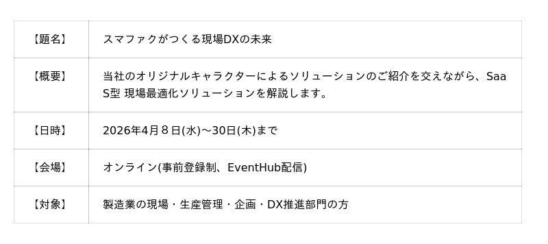 株式会社国際電気(代表取締役 社長執行役員 齋藤 拡二、以下「当社」)は、日本におけるスマートファクトリーの実現に向け、「ロケーションマネジメント」「スペーシングマネジメント」「ファシリティマネジメント」の3つのソリューションをテーマとしたウェビナー動画を、オンデマンド形式で配信します。人手不足や設備の老朽化、工場の属人化といった製造業が直面する課題に対し、データと可視化を活用した実践的な現場DXの進め方を分かりやすく解説します。