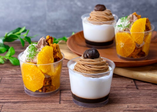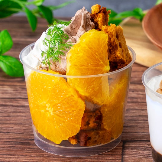 半透明素材であるPP(ポリプロピレン)の透明度を極限まで高め、ゼリーやパフェの中身を美しく見せるカップが登場。軽量でリーズナブルでありながら、植物由来バイオマス原料を配合した環境配慮型カップです。
