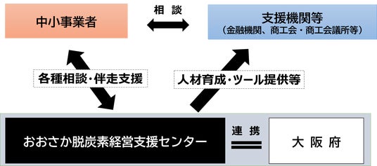 おおさか脱炭素経営支援センターでは、大阪府や各機関(金融機関、商工会・商工会議所等)と連携しながら、脱炭素に取り組む事業者の取組状況に応じた支援メニュー等の提案や伴走支援を行っていきます。脱炭素経営に取り組みたいとお考えの大阪府内の中小事業者の皆様は、ぜひお気軽にご相談ください。