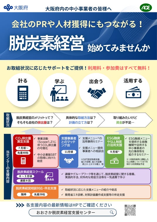 一般財団法人大阪府みどり公社(本部:大阪府大阪市、代表:南部 和人)内に拠点をおく「大阪府地球温暖化防止活動推進センター」は、このたび大阪府と連携し、「おおさか脱炭素経営支援センター」を開設いたしました。
